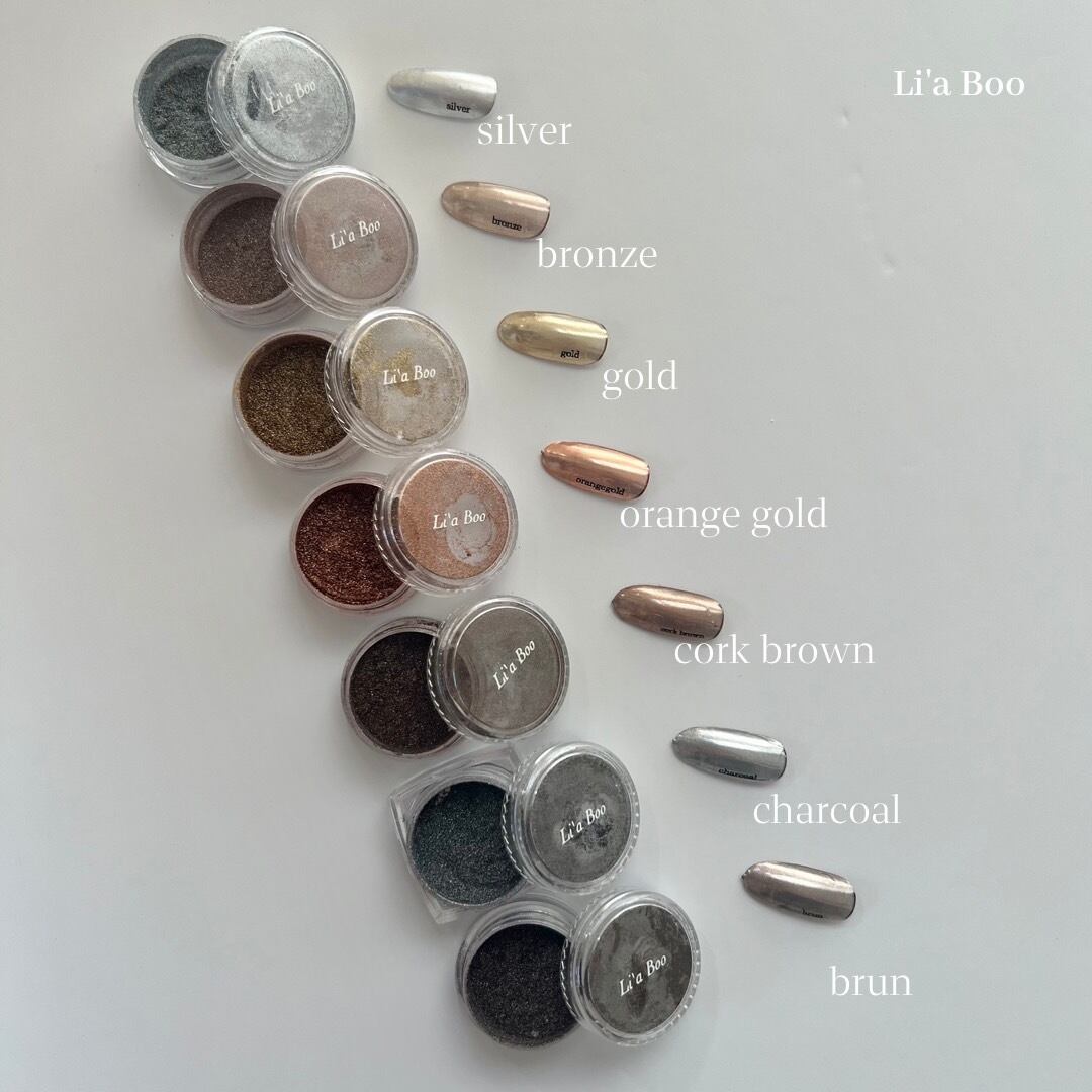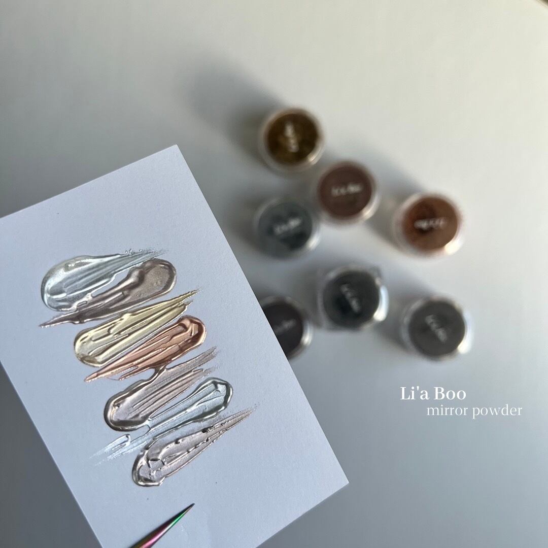絶妙なバランスくすみ感のある サテンのようなミラーパウダーになります。 ニュアンスデザインや キレイめなデザインにもご使用頂けます。 (A) silver (B) bronze (C) gold (D)orangegold (E)brun (F)coke brown (G)charcoal くすみ感のあるミラーです マットにするとサテン感がでて可愛く 人気商品です♪